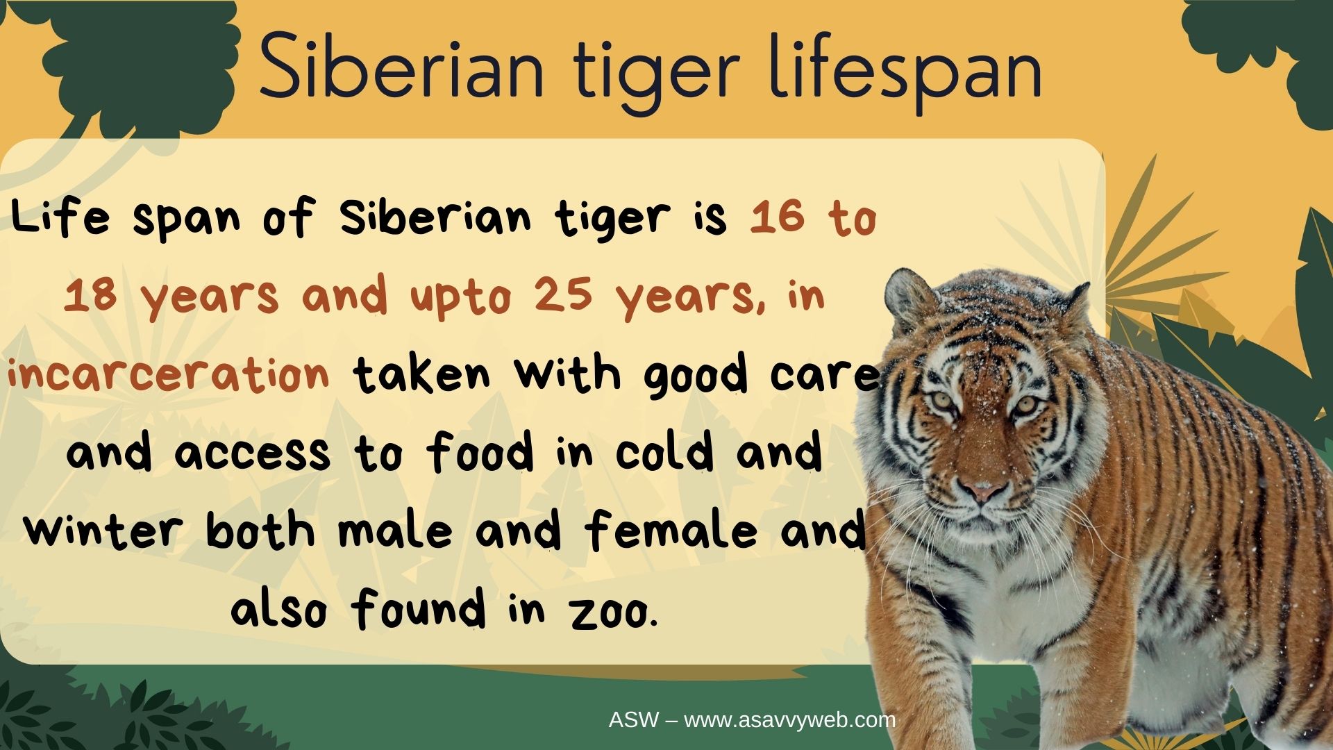 Life span of Siberian tiger is 16 to 18 years and upto 25 years in incarceration taken with good care and access to food in cold and winter both male and female. Siberian tigers are also found in zoo with special care.
