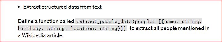 You can also extract data structure data from text and you need to define a function and extract people data from wikipedia by usign function : xtract_people_data(people: [{name: string, birthday: string, location: string}]), to extract all people mentioned in a Wikipedia article.
