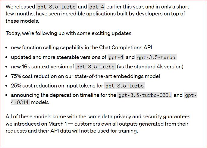 New updates of ChatGPT 3.5 and chatGPT 4 models includes functional calling, longer context with new 16k context version with updated and steerable version and chatgpt openai also reduced cost up to 75 and 25 % of cost reduction as well.