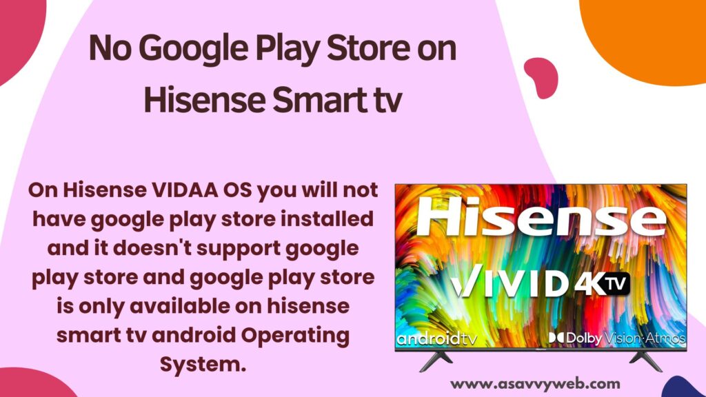 On Hisense VIDAA OS you will not have google play store installed and it doesn’t support google play store and google play store is only available on hisense smart tv android Operating System.