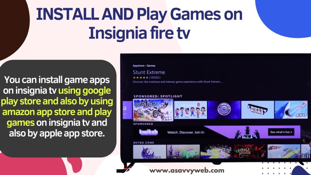 You can install game apps on insignia tv using google play store and also by using amazon app store and play games on insignia tv and also by apple app store.