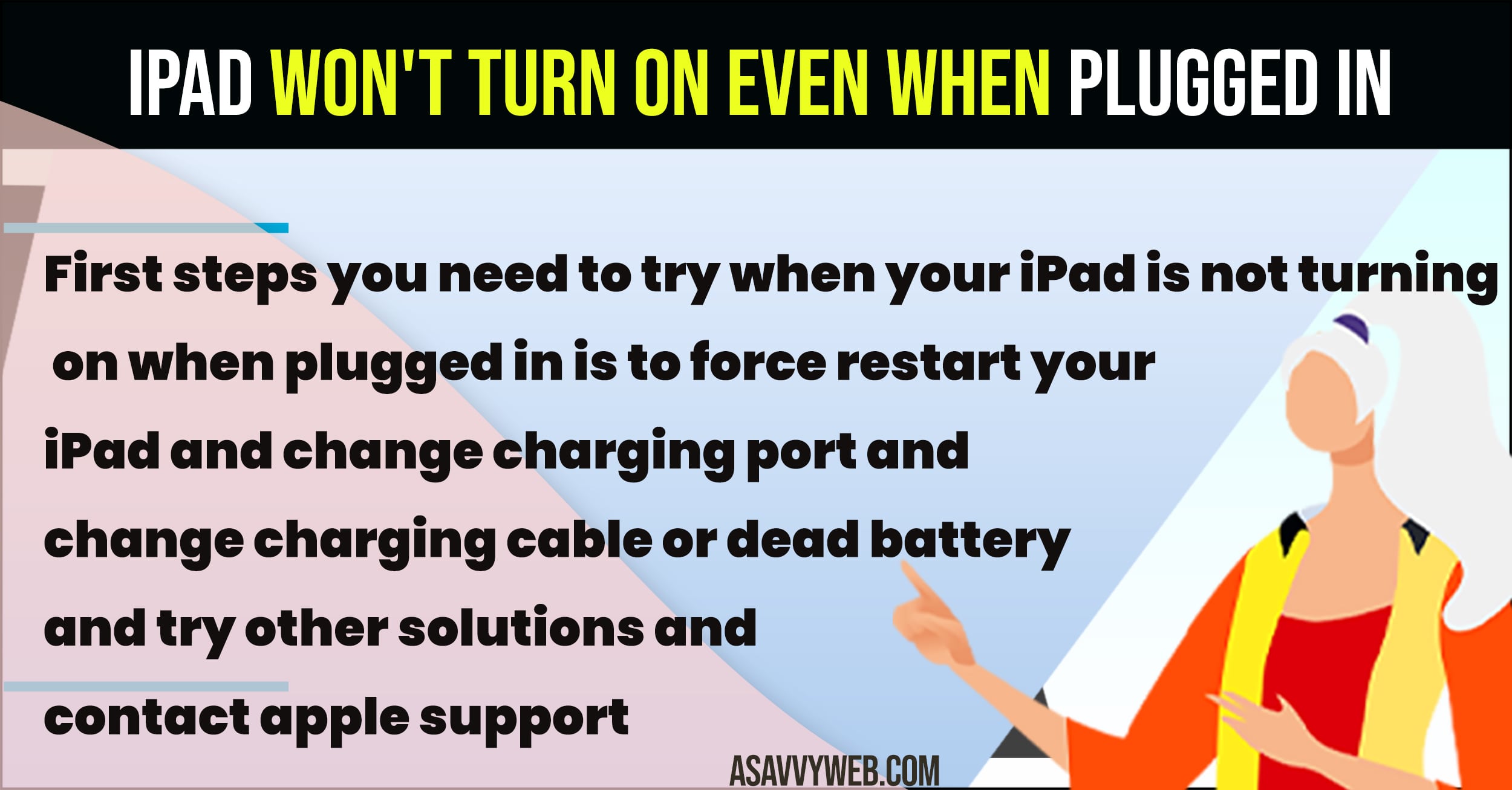 First steps you need to try when your iPad is not turning on when plugged in is to force restart your iPad and change charging port and change charging cable or dead battery and try other solutions and contact apple support if you can turn on iPad.