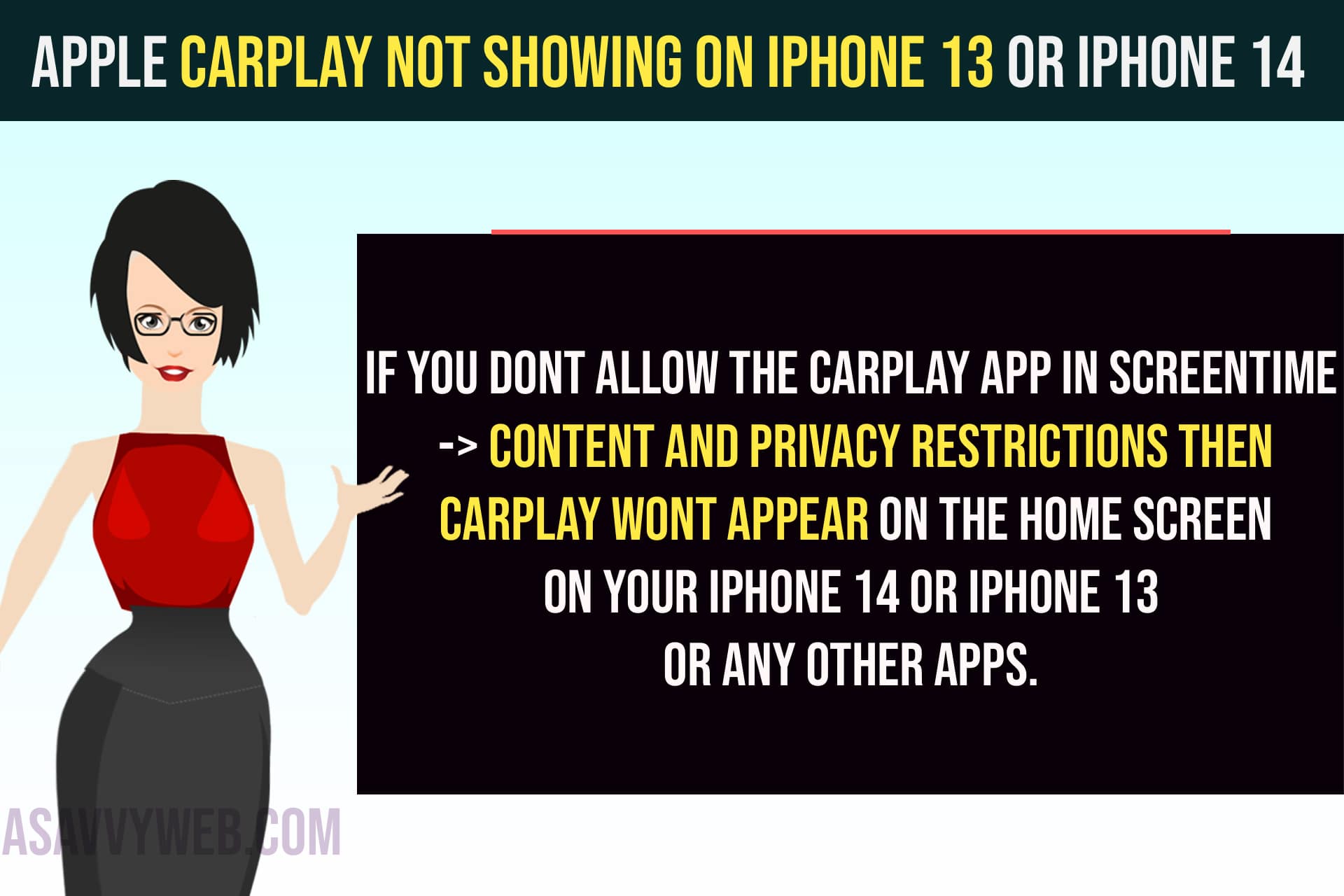 If the iPhone is not showing carplay then this is due to restrictions that are applied in screen time settings and you can turn off screen time or allow carplay app in content and privacy restriction settings on iPhone 14, 13.