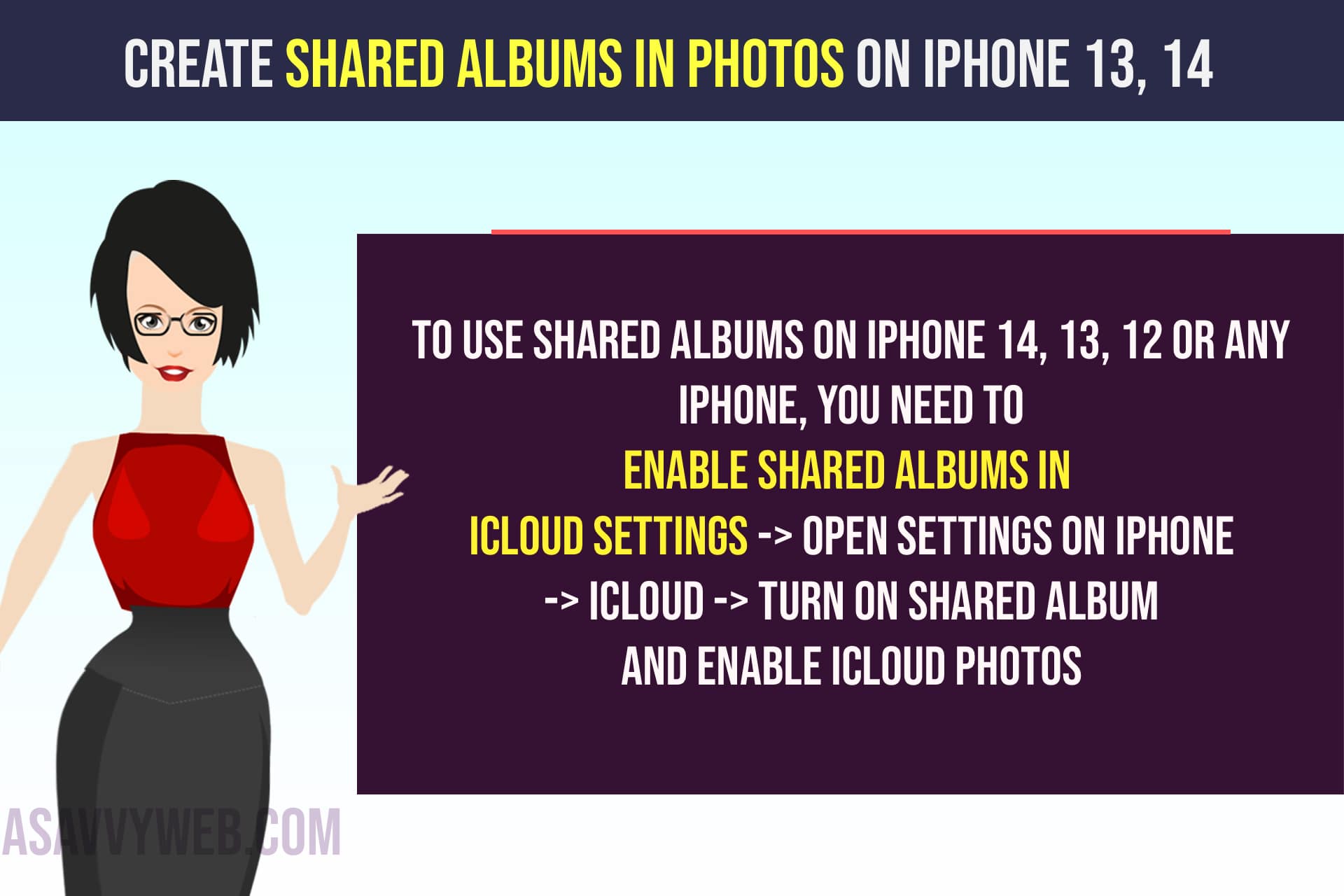 To use shared albums on iPhone 14, 13, 12 or any iPhone, you need to enable shared albums in iCloud settings -> Open settings on iPhone -> iCloud -> turn on shared album and enable iCloud photos.