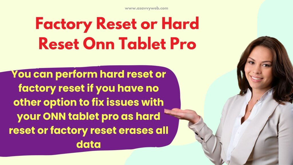 You can perform hard reset or factory reset if you have no other option to fix issues with your ONN tablet pro as hard reset or factory reset erases all data including photos, videos, apps and other data and you might lose important data.