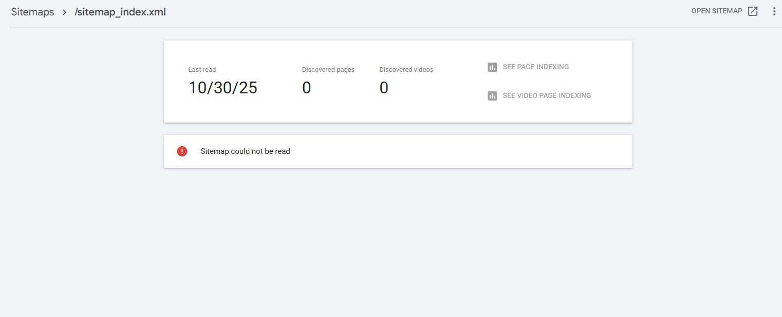 This error is most common as well, sitemap could not be read error, if it is a sitemap index file then you can see this error most often, this is also not an actual error and this simply means that google bit did not read this sitemap file. If you see this error, then you need to click on open sitemap on top here and if you are able to see your sitemap file in browser then you are good and if you are seeing 404 or some other error then there is an issue, and this error can be ignored and the issue is with google systems here, not on your website.