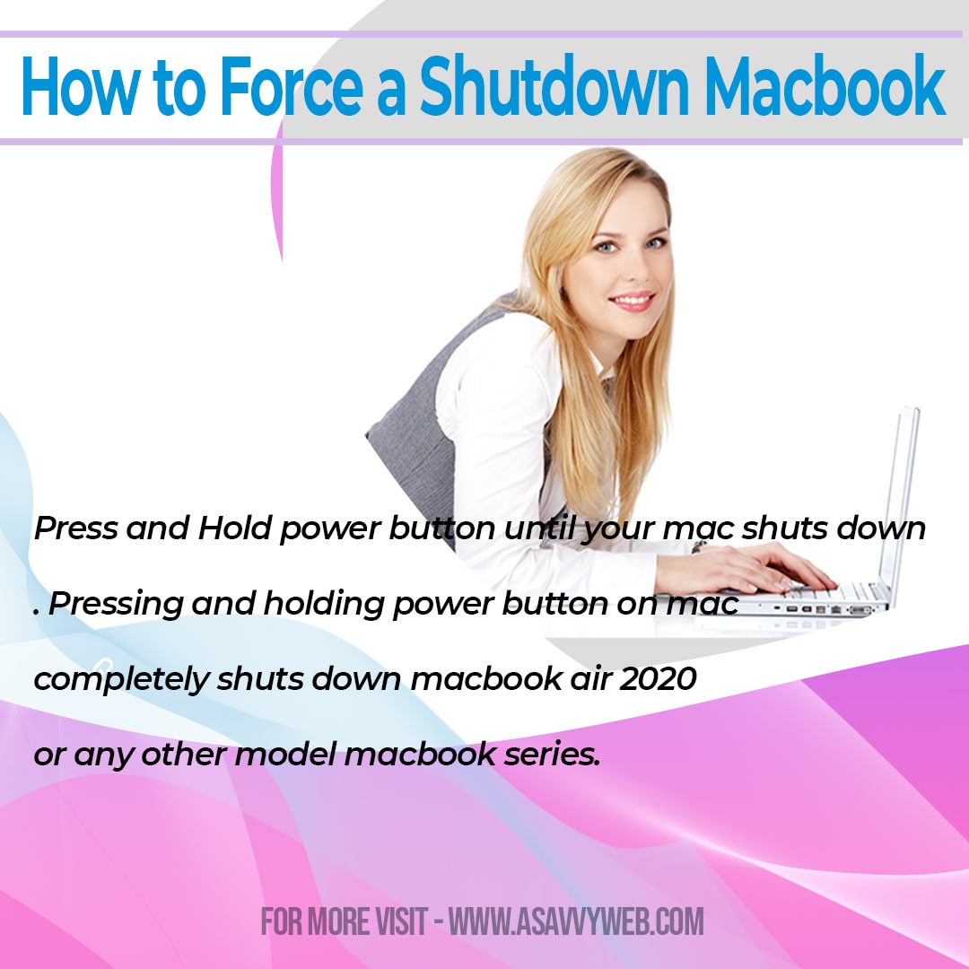 Press and Hold power button until your mac shuts down. Pressing and holding power button on mac completely shuts down macbook air 2020 or any other model macbook series.