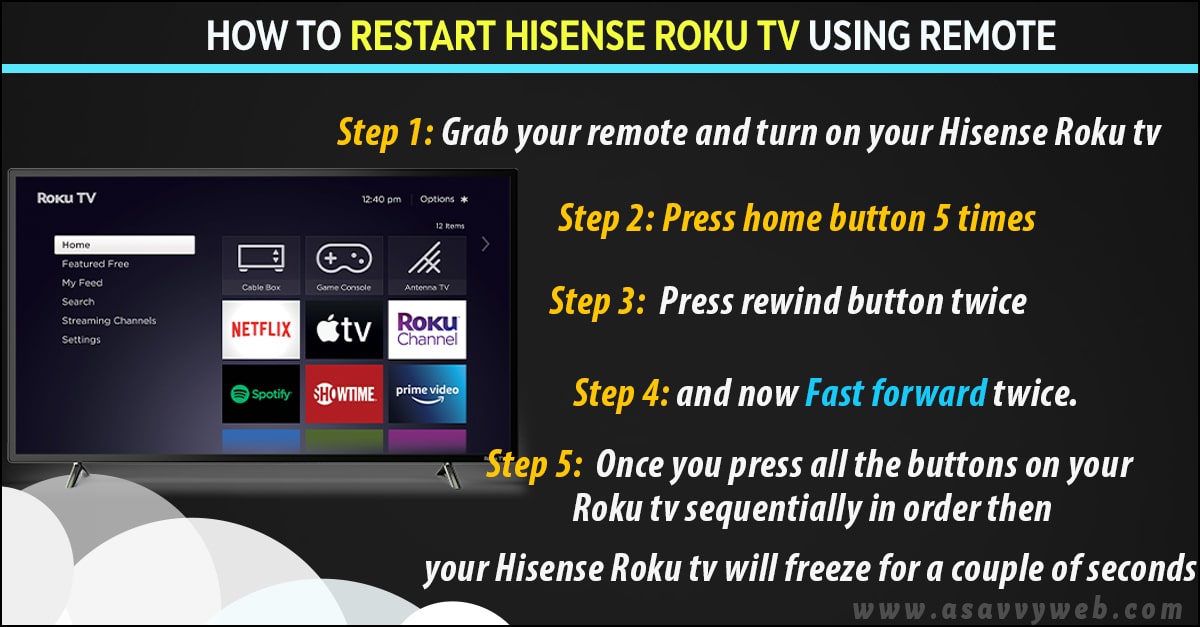 Hisense Roku tv can restart using remote using a key combination and pressing few button in an order to restart your Hisense Roku tv by using keys home button, up arrow and rewind, fast forward buttons.