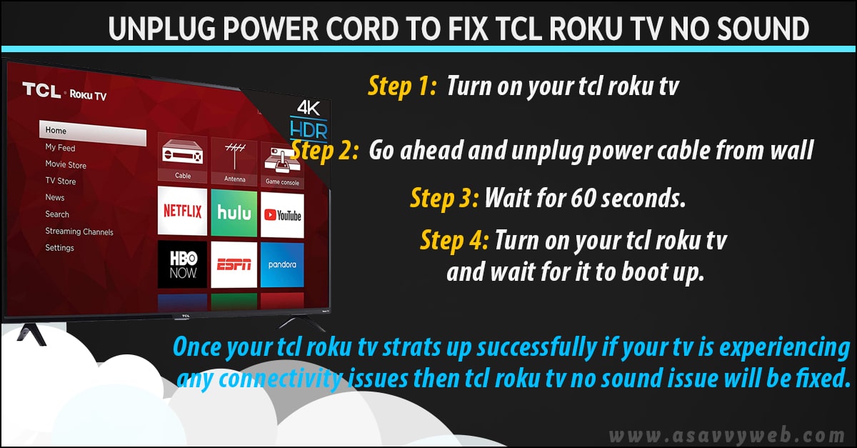 Unplug power cord to fix tcl roku tv no sound