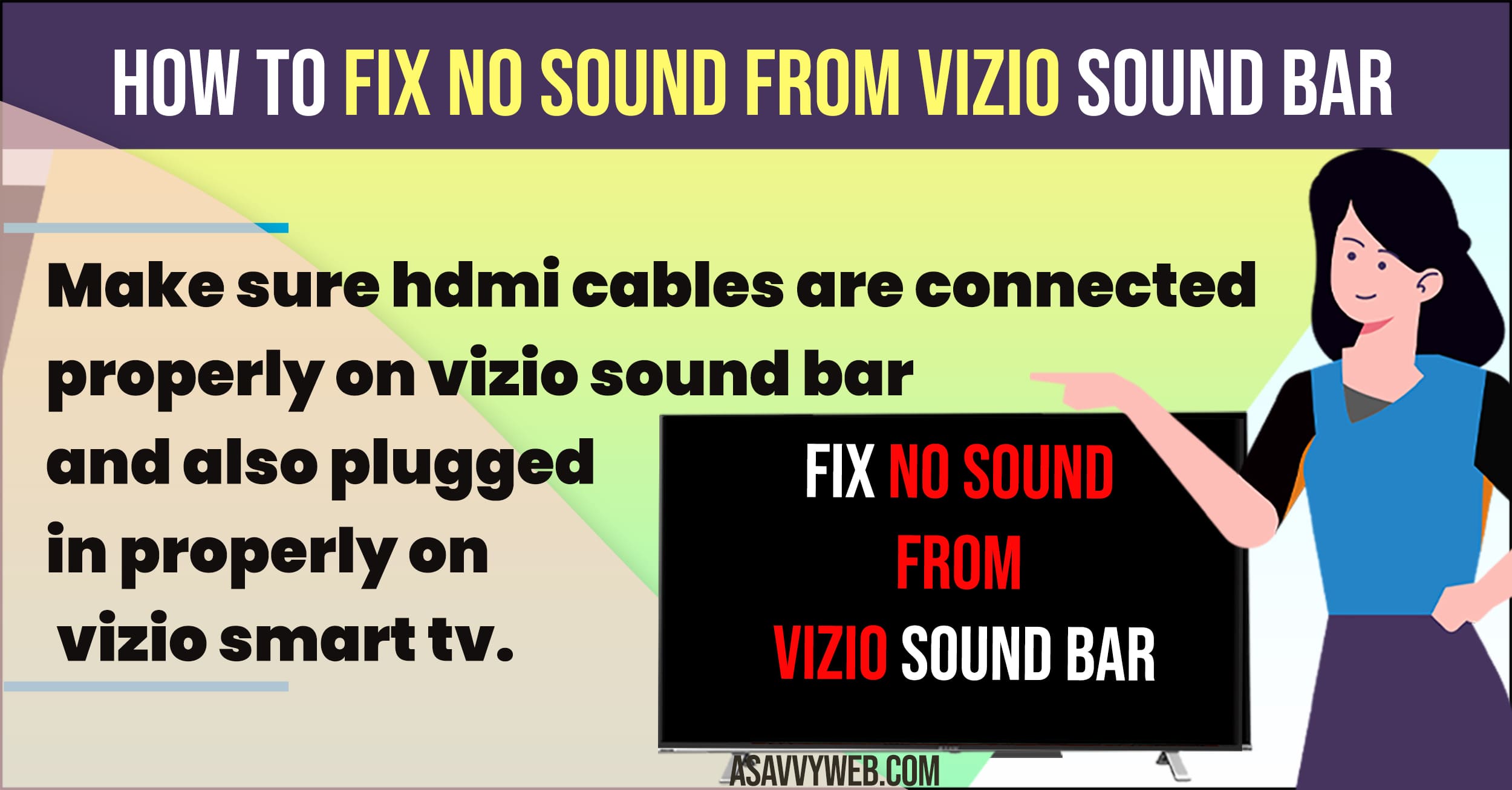 If you have connected sound bar on vizio smart tv and there is no sound from vizio sound bar but not muted or sound delay on vizio smart tv and make sure your sound bar is connected properly to vizio smart tv and plugged in properly without lose connection and remove sound bar plug and plug in sound bard cable tightly again and other vizio tv sound bar troubleshooting methods.