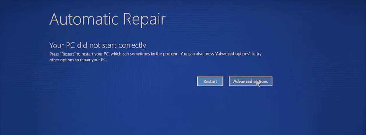 After a short wait you should see the screen “Your pc did not start correctly”.