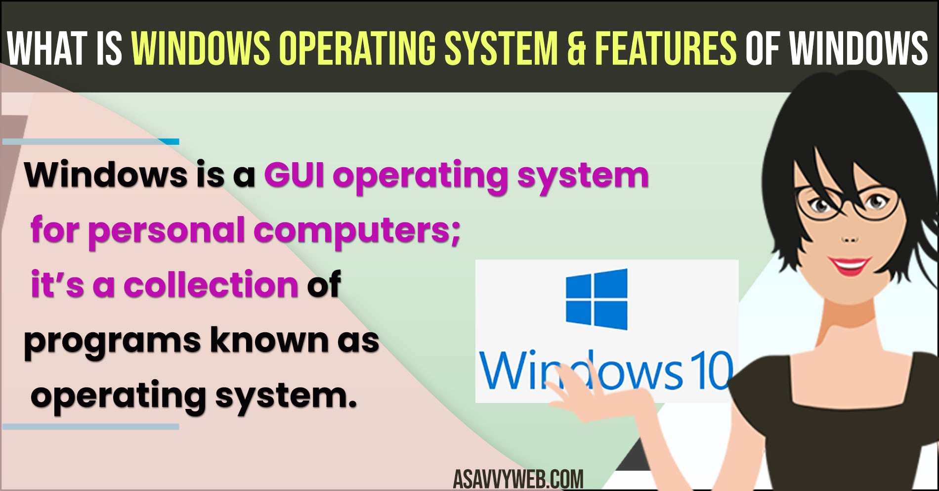 Windows is a GUI operating system for personal computers; it’s a collection of programs known as operating system. Windows or win is an operating system most of you I suppose to believe would be running this on desktop although windows can run on a laptop and also phones and tablets now windows is said to be operating system and that means that its not the computer itself it’s a software so the thing that the computer runs that that you interact with and then windows interacts with the computer and also interacts with you like the intermediate it talks to you and the computers.