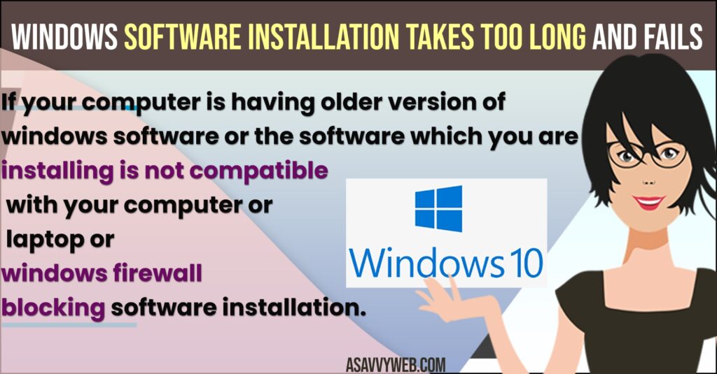 If windows computer is not compatible or running older version of windows update and windows update is required or it can also be with storage space and minimum system requirements or hardware related issues. Typical software install usually takes from 2 to 15 minutes some may take longer depending on the size of the program.