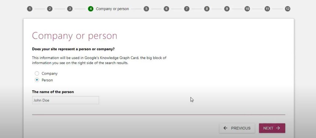 you have to choose an option of your website which represents a company or a person here. Choose appropriate option and click on next. If you choose person then you need to enter person name, if you choose company, then you need to type company name and logo of the company (website logo) here.